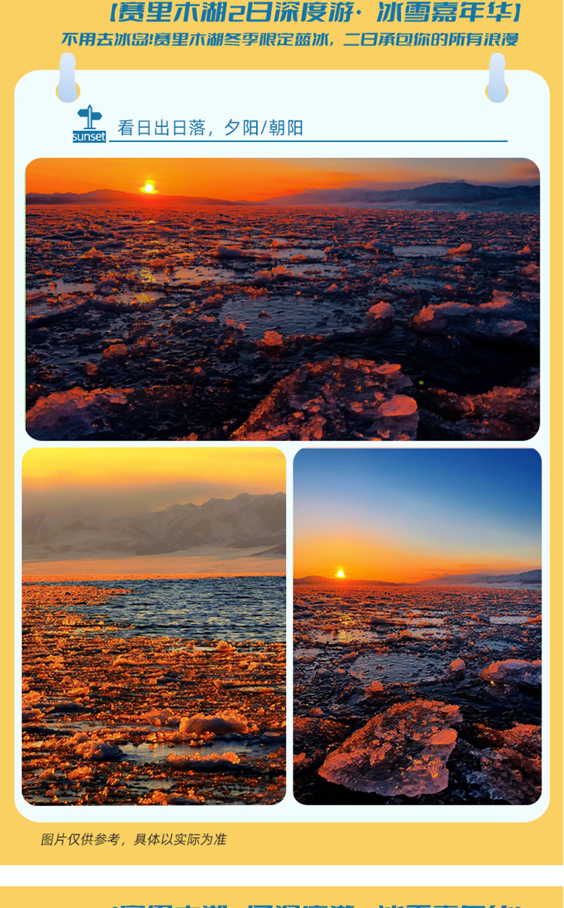 活动说明:本次活动精选赛湖三大日出黄金机位,向导将根据当日冰推分布、风向灵活调整,确保最佳观览效果: 1. 点将台:赛湖观日出经典点位,视野开阔无遮挡,可俯瞰冰湖全景,红日升起时为雪山、冰推镀上金边,日照金山与冰湖霞光同框,氛围感拉满。 2. 松树头:可同时观赏湖面蓝冰与远处雪山被晨光点燃的盛景,晨光穿过松枝洒向冰面,冰裂纹理折射出奇幻光影,是拍摄氛围感大片的绝佳位置。 3. 克勒涌珠:赛湖冬季唯一不冻水域,日出时晨光映着水面的天鹅倩影,冰裂纹理与波光交相辉映,动静结合的美景独具特色