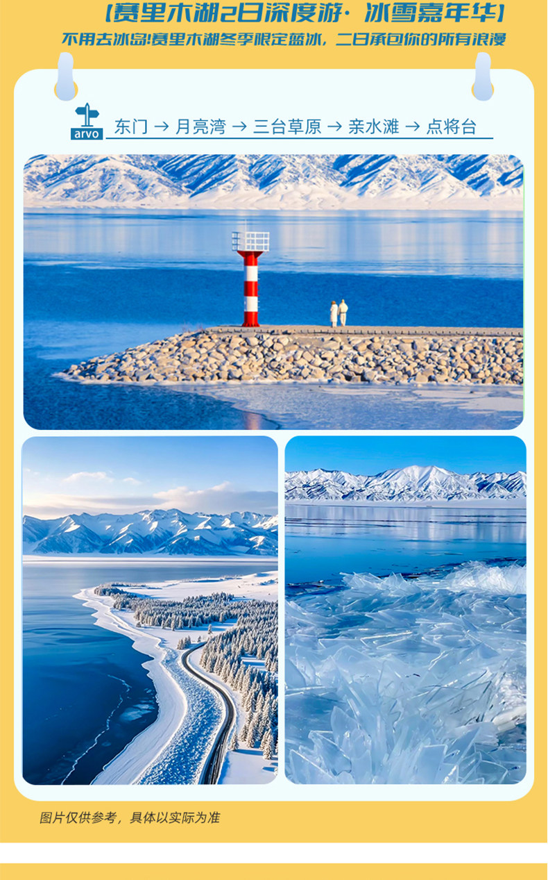 景点说明:赛里木湖(Sayram Lake):省级旅游名胜景区,第五批国家级风景名胜区,是新疆海拔最高、面积最大、风光秀丽的高山湖泊,又是大西洋暖湿气流最后眷顾的地方,因此有“大西洋最后一滴眼泪”的说法。赛里木湖位于新疆博尔塔拉蒙古自治州,是天山山脉中海拔最高、面积最大的高山冷水湖,素有“大西洋最后一滴眼泪”的美誉。景区为国家5A级旅游景区,湖水清澈湛蓝,四周雪山环抱、草原辽阔、云杉成林,四季风光绝美。冬季湖面冰封,呈现震撼蓝冰、冰泡、冰裂奇观,是北疆冬季必打卡的梦幻秘境。