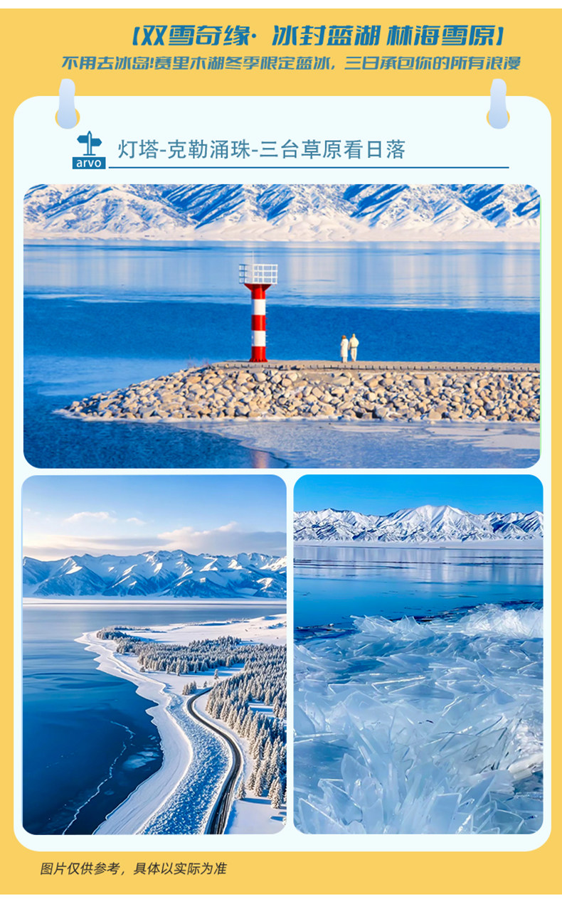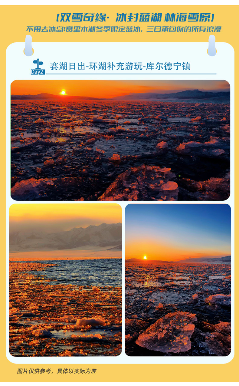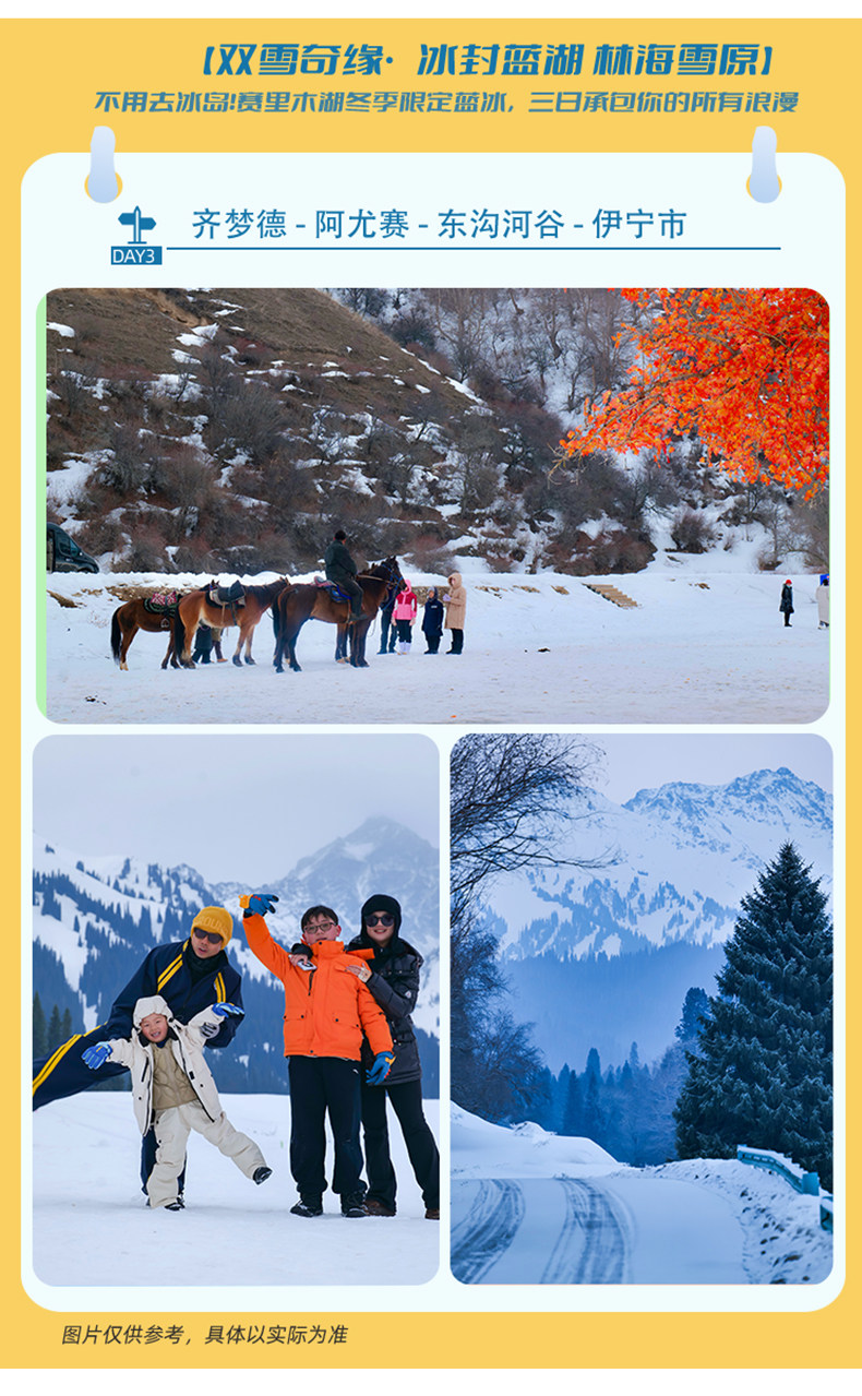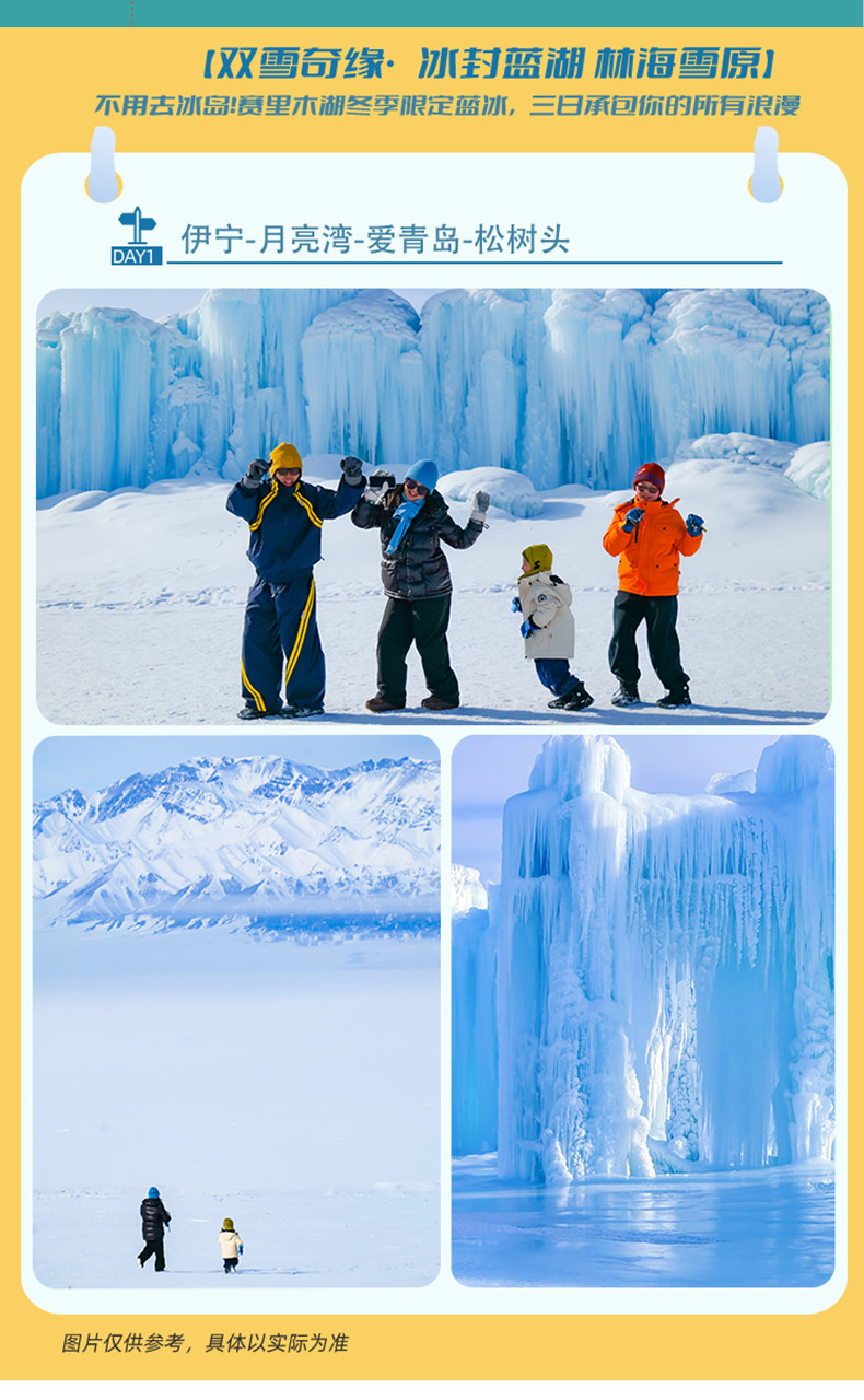 • 核心看点:360°俯瞰全湖+果子沟大桥+连绵雪山;雾凇雪松+冰湖同框