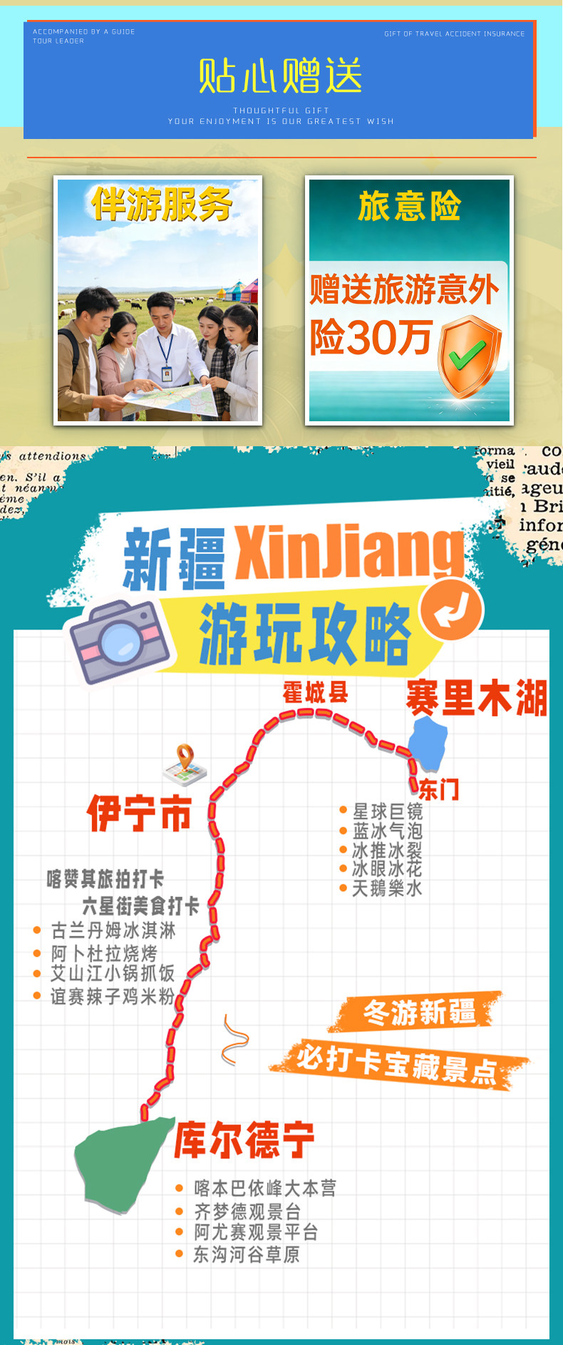 餐饮:营地/镇上吃哈萨克风味(手抓肉、奶茶、包尔萨克、炖羊肉);雪地火锅是冬季限定;自备能量零食(巧克力、牛肉干)。