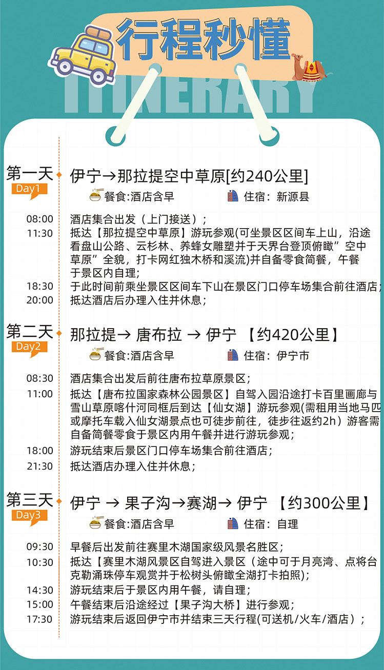 详情:送回伊宁酒店/火车站,建议定次日返程航班。如需赶夜班火车,请提前与客服和司机协商好送站时间。