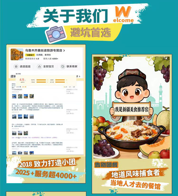 • 哈萨克家访:60–100元/人(奶茶+手抓饭+歌舞表演)