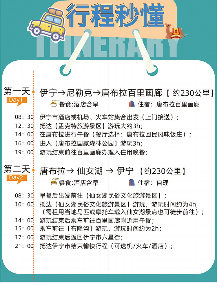 详情:可送到喀赞其民俗园散团,也可送回伊宁市区酒店/火车站,建议定次日航班返程。
