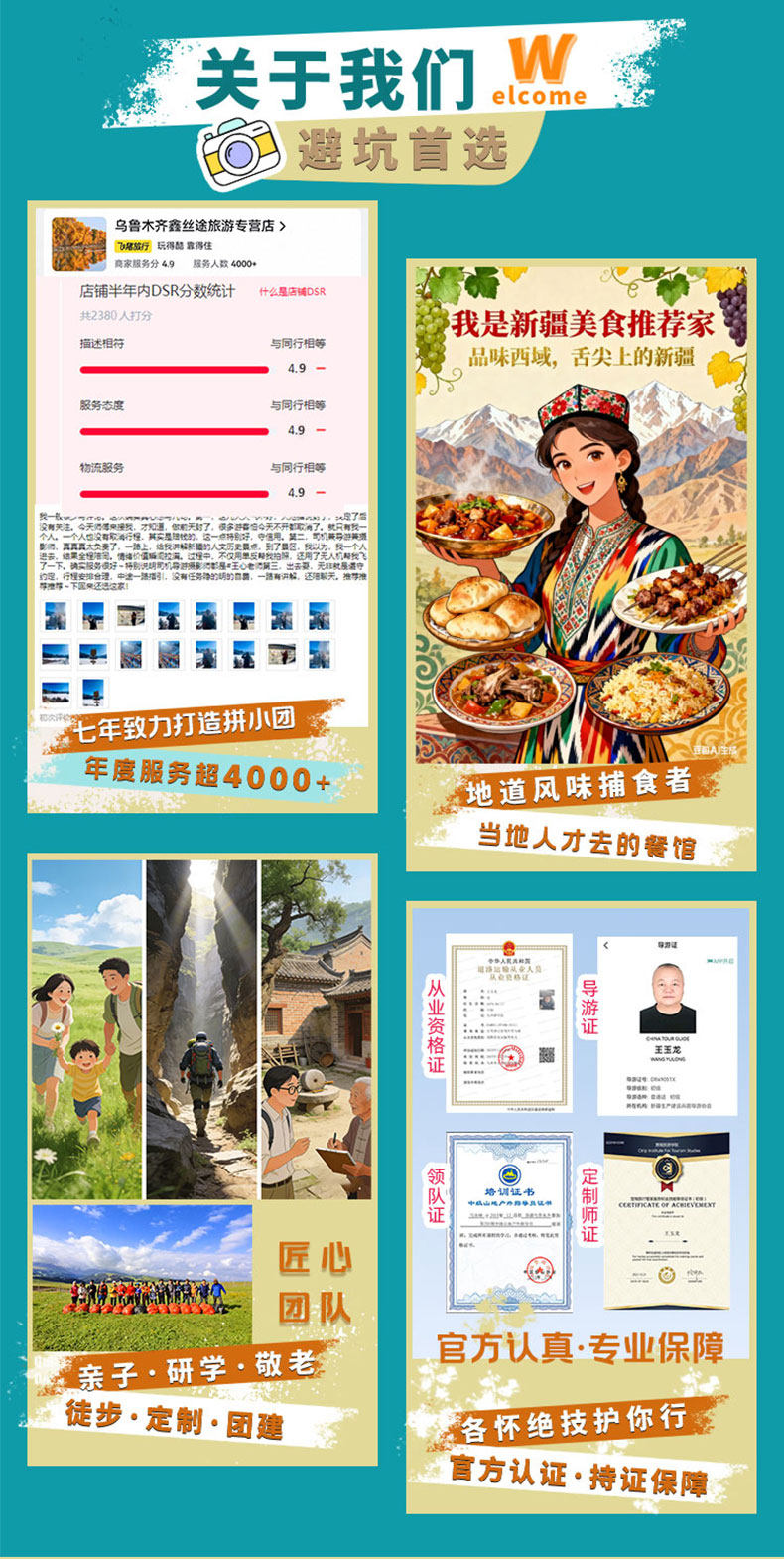 景点说明:·位于乌鲁木齐市天山区,是目前全国最大的巴扎集市,维吾尔族文化表现最集中、留存最完整的地方。·最著名的景点是广场中心的丝绸之路观光塔,塔内各层都有彩绘和展览,展示了丝绸之路的历史故事。·大巴扎内部贩卖着各种各样的新疆特色美食、手工艺品,品种多得让你眼花缭乱。·集伊斯兰文化、建筑、民族商贸、娱乐、餐饮于一体,是新疆旅游业产品的汇集地和展示中心。