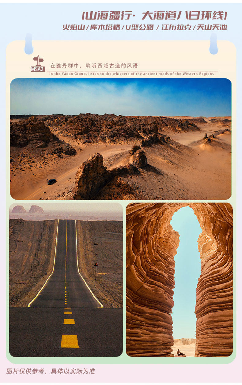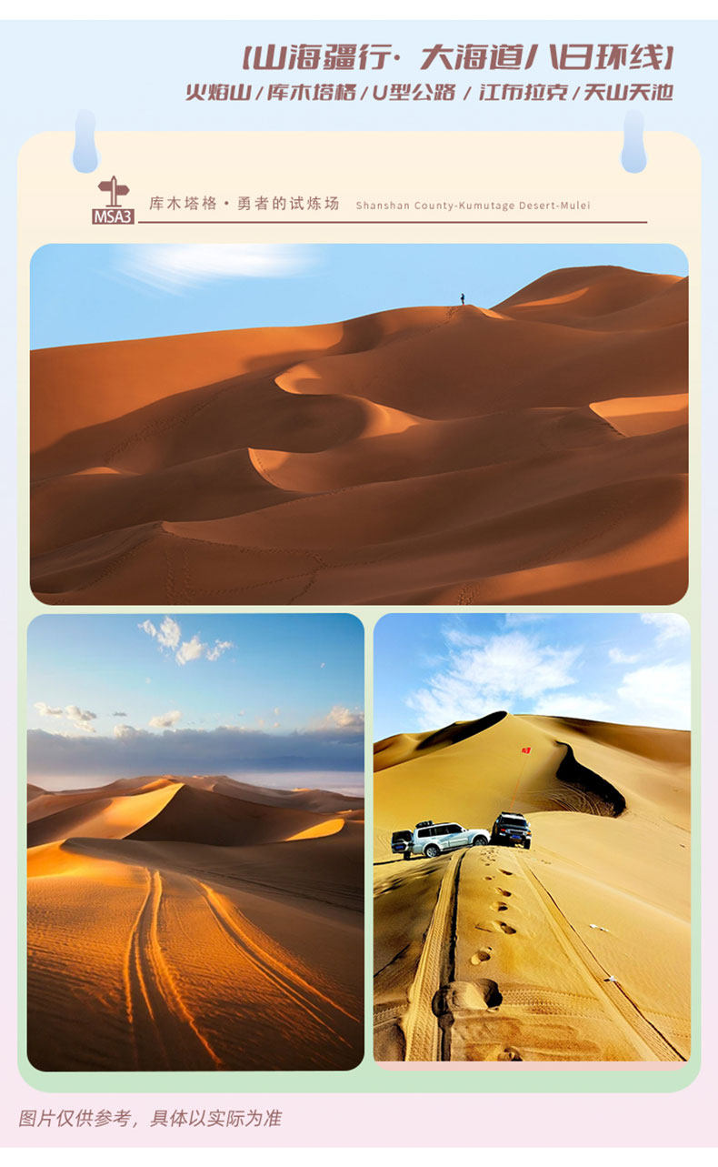 景点说明:库木塔格沙漠风景名胜区位于新疆维吾尔自治区鄯善县城南部,“库木塔格”维吾尔语是“沙山”的意思。 库木塔格沙漠是新疆的第五大沙漠,中国的第十大沙漠之一。库木塔格沙漠汇集了世界各大沙漠类型,是世界上唯一一座与城市相连的沙漠,有“城中沙漠”之称,沙漠与绿洲紧密相连,创造了“沙不进、绿不退、人不迁”的奇迹,主要沙漠特征类型有:纵向沙垄、复合型沙垄、新月形沙丘链、金字塔形沙山、新月形沙丘、蜂窝状沙地等。 景区内有沙漠观光车、沙漠冲浪车、沙地摩托车、灯光秀、滑沙、沙湖泛舟、葡萄采摘、沙漠宿营、“夜楼兰”沙漠实景演出、三角翼等游乐体验项目,是沙漠越野、探险、沙漠排球、沙漠足球、夜宿沙漠等项目的理想场所。