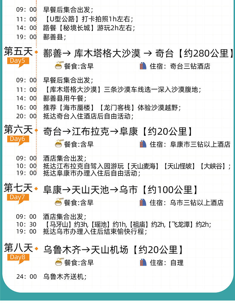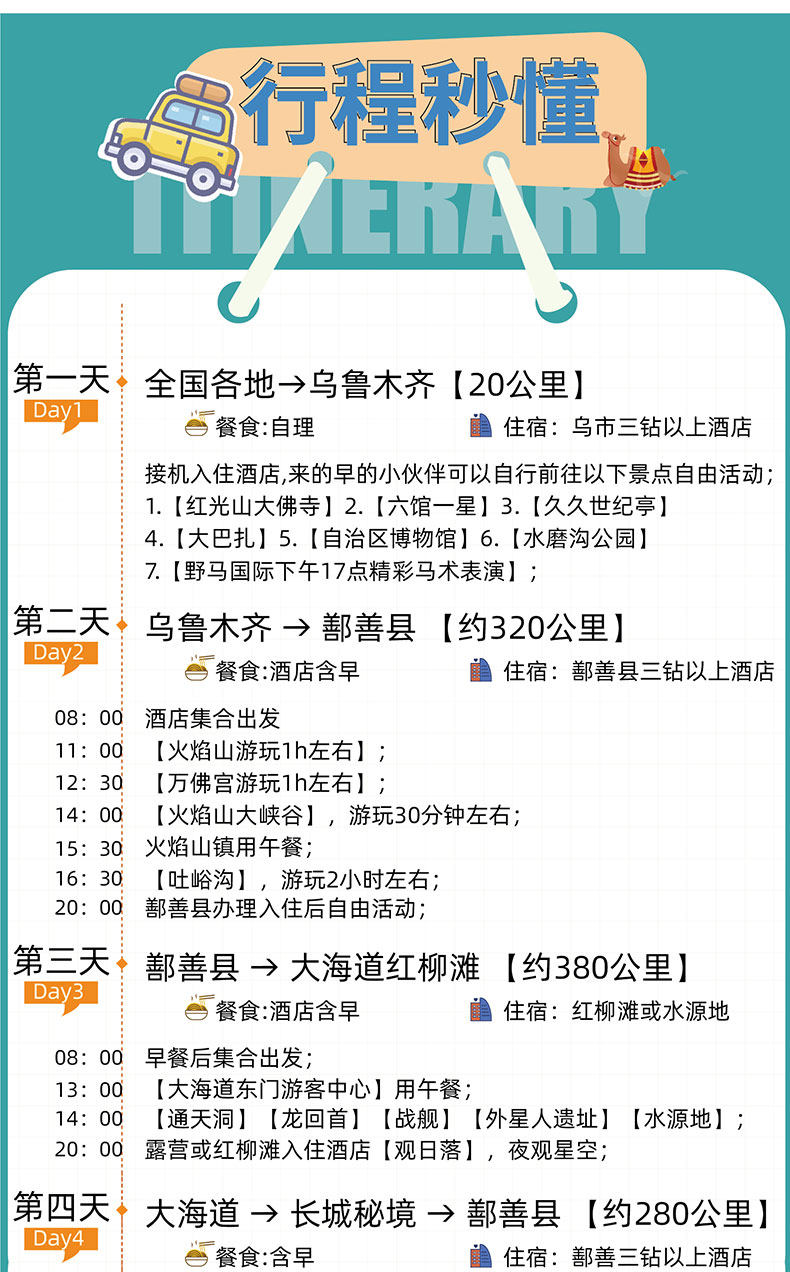 餐饮说明:沿途或景区用午餐,请自理。也可自带简餐零食。