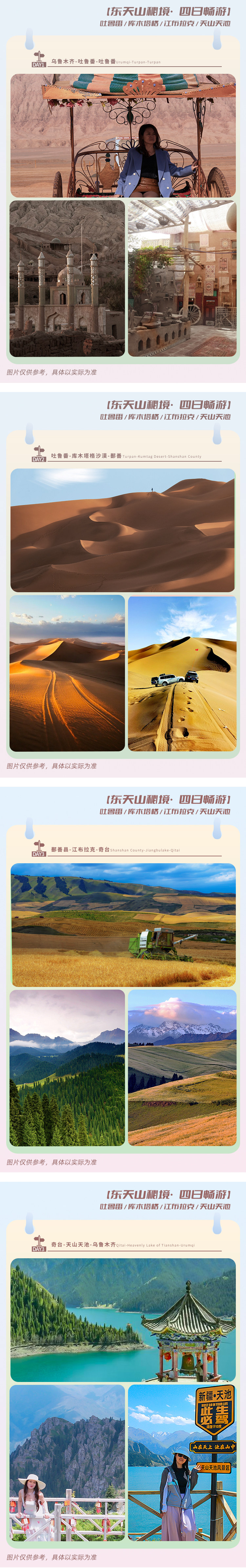 景点说明:库木塔格沙漠风景名胜区位于新疆维吾尔自治区鄯善县城南部,“库木塔格”维吾尔语是“沙山”的意思。 库木塔格沙漠是新疆的第五大沙漠,中国的第十大沙漠之一。库木塔格沙漠汇集了世界各大沙漠类型,是世界上唯一一座与城市相连的沙漠,有“城中沙漠”之称,沙漠与绿洲紧密相连,创造了“沙不进、绿不退、人不迁”的奇迹,主要沙漠特征类型有:纵向沙垄、复合型沙垄、新月形沙丘链、金字塔形沙山、新月形沙丘、蜂窝状沙地等。 景区内有沙漠观光车、沙漠冲浪车、沙地摩托车、灯光秀、滑沙、沙湖泛舟、葡萄采摘、沙漠宿营、“夜楼兰”沙漠实景演出、三角翼等游乐体验项目,是沙漠越野、探险、沙漠排球、沙漠足球、夜宿沙漠等项目的理想场所。
