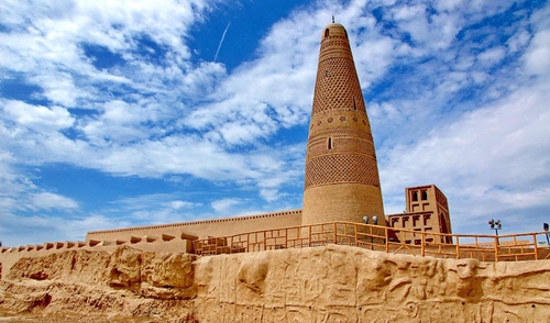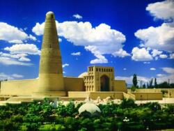 景点说明:苏公塔是一座造型新颖别致的伊斯兰教古塔,它是新疆境内现存最大的古塔,全部用青灰色砖建成。高44米,塔基直径为10米,塔身下大上小,呈圆锥形。塔内有螺旋形台阶72级通往顶部。塔身周围不同方向和高度,设有14个窗口。塔的表面分层砌出三角纹、四瓣花纹、水波纹、菱格纹等15种几何图案,具有浓厚的伊斯兰建筑风格。位于吐鲁番市东南2千米许一处开阔的空地上,塔的南面就是安乐古城遗址。 苏公塔全是用一式的灰黄色砖砌成的圆形巨塔,塔高37米,基部直径10米。塔门入口处有两通阴刻石碑立于塔下,一为维吾尔文,一为汉文。 与苏公塔相邻的苏公塔礼拜寺,是新疆境内大的伊斯兰教清真寺之一,占地2500平方米,室内宽敞,建筑庄严、古朴、可容纳上千人做乃玛孜。每逢肉孜节、古尔邦节,穆斯林群众,近的三人一群、五个一簇涌向礼拜寺;远的,骑毛驴、骑自行车、坐汽车从四面八方云集这里,颁经礼圣,祈求福佑。