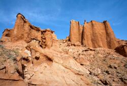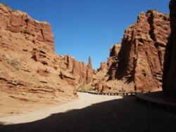 景点说明:天山神秘大峡谷又叫克孜利亚大峡谷,位于新疆阿克苏地区库车县北部。克孜利亚维吾尔语意是“红色的山崖”,这是因为大峡谷由红褐色的巨型山体群组成。天山神秘大峡谷红褐色的山体群直插云天,在阳光照射下,犹如一簇簇燃烧的火焰。 进入谷内,在红褐色的山峦中步行,仿佛进入了一个幽静清凉的世界。谷口十分开阔,但是深入谷中,峰回路转,时而宽阔,时而狭窄,有些地方仅容一人侧身通过。谷底比较平坦,许多时候都能够闲庭信步,两侧是高耸的石壁,脚下是细沙,不少路段还覆着一层浅浅的水,结着薄薄的一层冰。抬头仰望,在蓝天的映照下,奇峰异石千姿百态,数不胜数,神犬守谷、旋天古堡、显灵洞、玉女泉、卧驼峰等景观个个形态逼真。 峡谷中神秘的阿艾石窟距谷口不足2公里,高悬于绝壁之上,最初仅可攀着30多米高的悬梯而上,如今旁边已经加建了石阶栈道。根据考证,石窟建于盛唐中期。石窟很小,深不足5米,约一人高,洞顶呈拱形。窟内三面皆有残存的壁画,而壁画上竟然罕有地出现了汉字,与古西域地区其他数百座石窟相迥异,充分显示汉文化的痕迹。