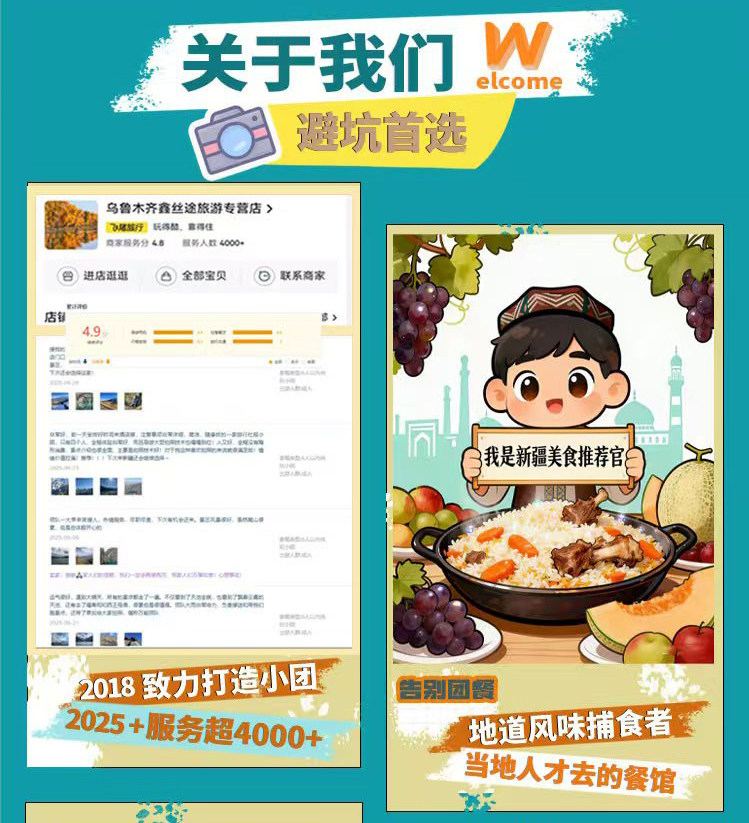• 哈萨克家访:60–100元/人(奶茶+手抓饭+歌舞表演)