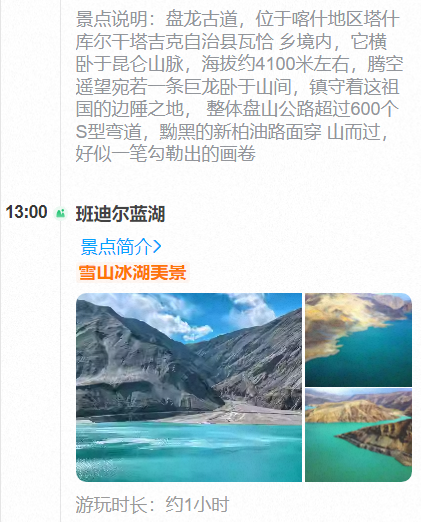 【景点门票】:139秘境、塔里木胡杨湿地luo罗布淖尔、塔里木胡杨林、塔克拉玛干大沙漠、喀什古城、白沙湖、喀拉库勒湖、慕士塔格峰4号冰川、瓦罕走廊、盘龙古道、班迪尔蓝湖