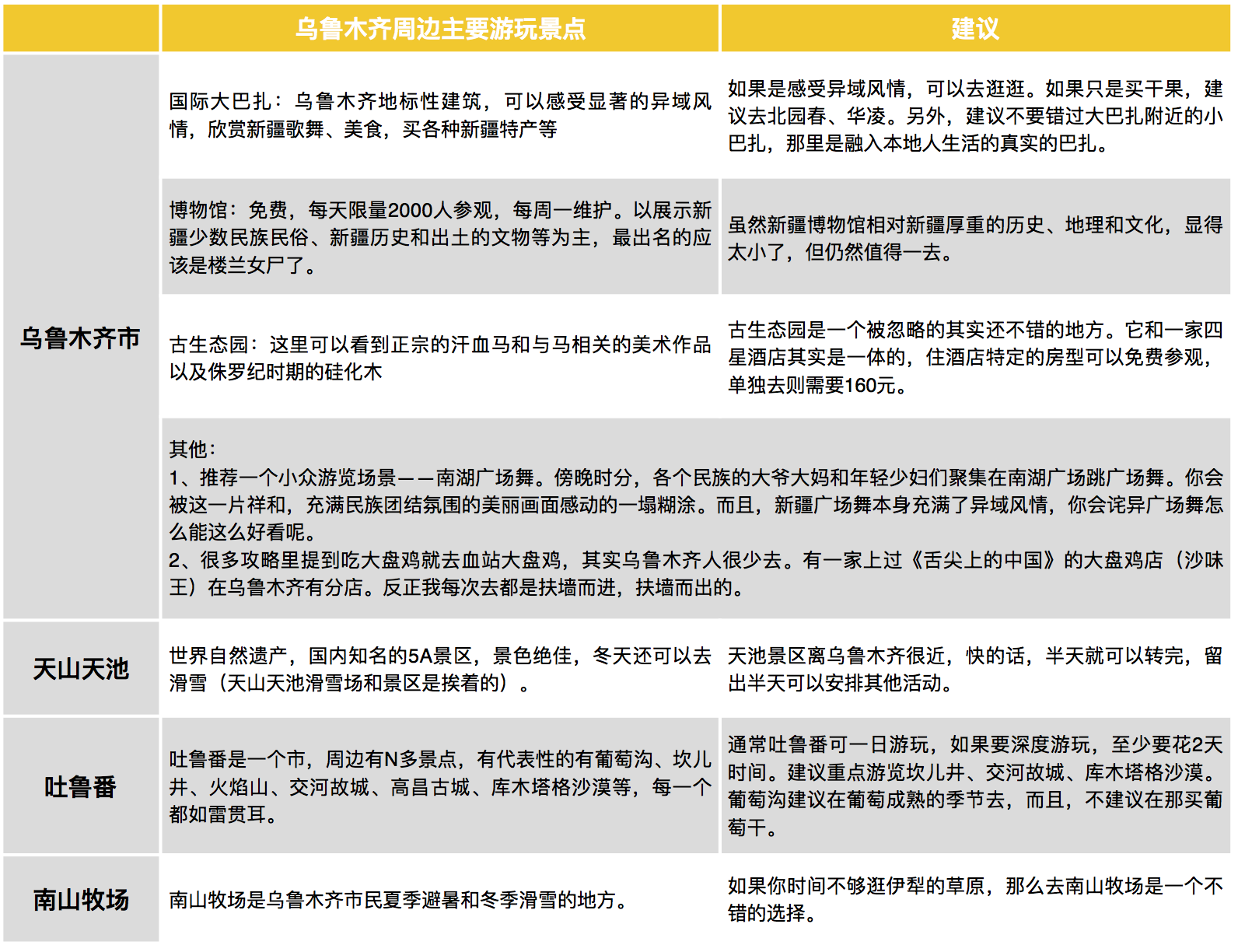 天山天池下面用一张表格,简单介绍一下乌鲁木齐市及周边的主要景点,并给出一些游览建议。